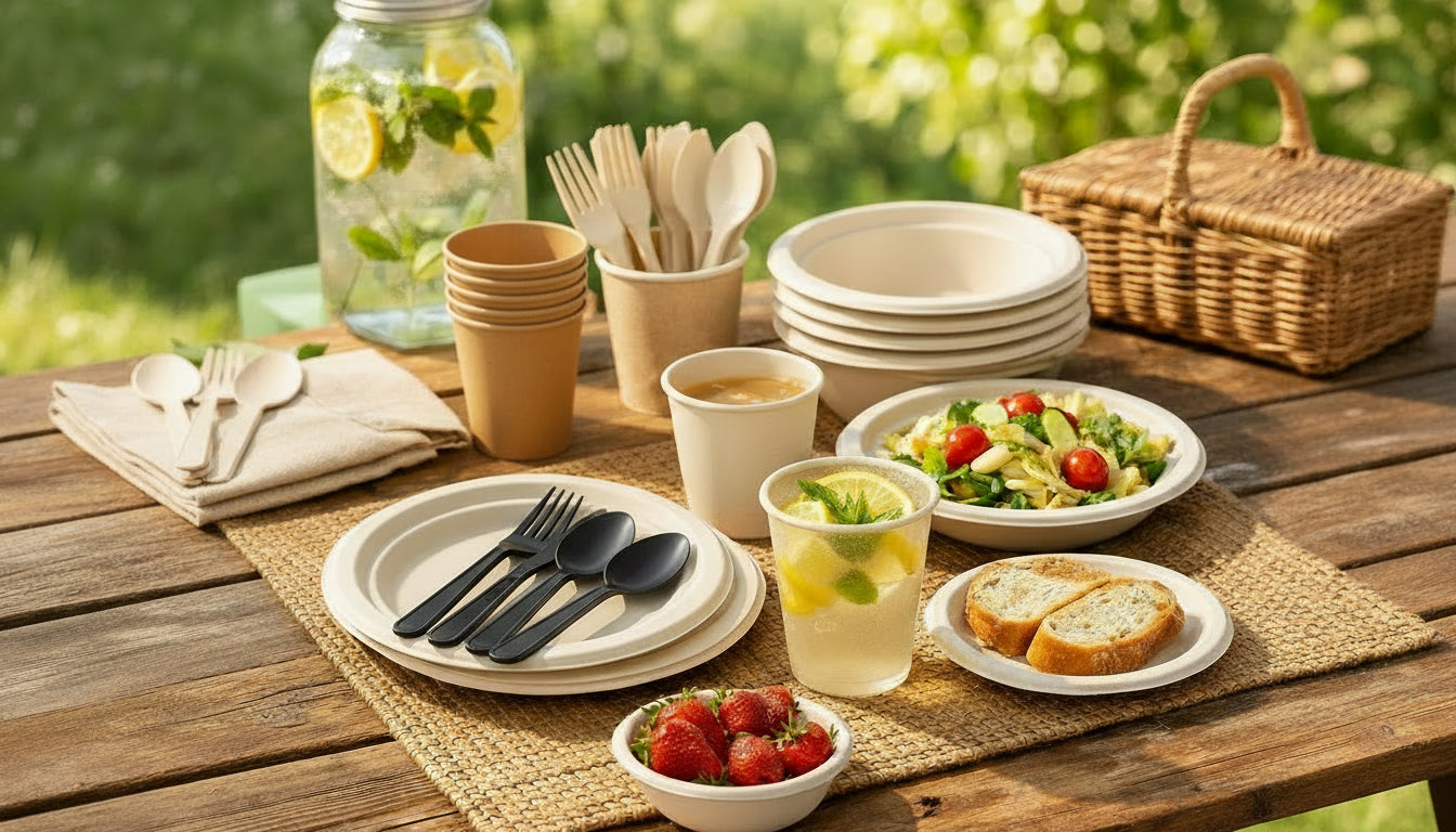 צלחות מתכלות מקנה סוכר, תירס, עלי דקל, במבוק וחיטה